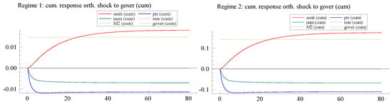 Figure 6 shows the impact of policy shocks on transaction volume under the two regimes. After the policy was lifted, the transaction volume decreased significantly. After a one-standard-deviation shock to the policy, in Regime 1, the transaction volume response decreased by an extent of over −0.01 and reached the lowest and stabilized in the 40th period; in Regime 2, the transaction volume response decreased significantly by more than −0.1. In Period 40, it reached a minimum level and kept being stabilized until the end. Afterwards, whether it was the first district Regime or the second district Regime, the response to the transaction volume after the policy shock of the regulatory year dropped significantly, indicating that the tightening of the short-term regulatory policy has significantly reduced the transaction volume.