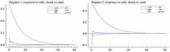 Figure 7 shows the impact of sentiment shocks on cyclical prices. In Regime 1, after the sentiment was impacted, the cyclical price rose to reach the highest level in period 34 and subsequently remained stable. In Regime 2, sentiment had a negative impact on price in the first period but immediately changed in the second period, and maintained a positive impact until the impact disappeared. It peaked at 44 and remained stable. After the sentiment shock, real estate cyclical prices rose significantly. Higher sentiment boosted real estate cycle prices significantly, no matter whether during policy was tightened or eased. All these results contribute to the proof of Hypothesis 2.