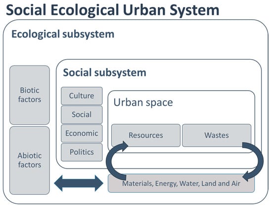 This initial comparison between ISWM and SWM allows us to identify the key elements and indicators necessary for developing a system dynamics model to achieve sustainable waste management. At the city level, this model represents the socio-ecological urban system as a complex interplay of stocks and flows between the ecological and social subsystems (Figure 2). It encompasses the interactions of these flows across different spatial and temporal scales, involving not only the ecological subsystem within the urban environment (including both biotic and abiotic factors) but also non-urban ecosystems where waste may be transferred. Furthermore, the model considers the influence of various factors such as economic structure, urban form, informality, and evolving sociocultural practices on waste generation and management. Additionally, the model examines the potential impacts of waste management practices on local health, quality of life, and urban adaptation, considering aspects such as urban vulnerability to flooding and overall resilience [42,43,44]. As highlighted by Haberl et al. [45], the ecological and social subsystems coevolve in a non-directional manner, constituting two distinct spheres of causality. From this perspective, socio-ecological systems comprise a biophysical sphere of causation, governed by natural laws, and a cultural sphere of causation, perpetuated through symbolic communication. Accordingly, we represented the social sphere as a “subsystem” embedded within the ecological subsystem. Together, these components form the socio-ecological urban system described.