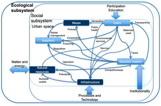 The m-SWM4Cities model moves beyond the premise of a simple urban socio-ecological system for sustainable management of waste. A system, as we understand, is the combination of elements that act together to achieve a specific objective [60]; in our case the objective is sustainable management of waste. An element is a particular unit with a function in the system; in our case, it could be processes, actors, activities or resources related to the operation of waste management.