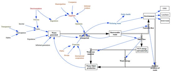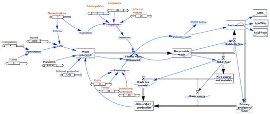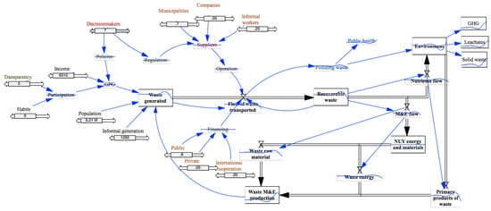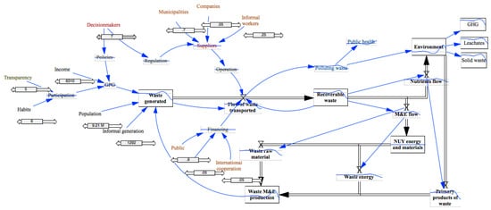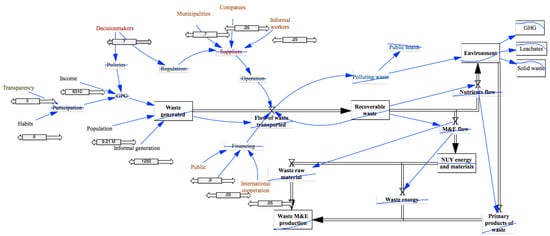 After defining the m-SWM4Cities model, it has been applied to the case of Mexico City, from now on called mD-SWM4CDMX. For this model, we adapted a general model of the cities’ conditions to Mexico City, delineating it as a dynamic system. The proposed mD-SWM4CDMX dynamic model considers the elements, processes, and actors related to sustainable waste management in Mexico City, including technical, economic, social and environmental aspects, all of which are presented in Appendix A. For this reason, the this system is applied from an analytical integrative approach, that is, the proposed model aims to comprehensively analyze the sustainable management of waste observing the effects of the relationships present in the analyzed urban socio-ecological system. Figure 6 shows a graphical representation of this model.