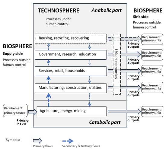 Understanding the relationship between the technosphere—i.e., the part of the environment created and modified by humans [45]—and the biosphere can be analyzed through their primary flows. The metabolism of social-ecological systems reflects the interaction of the economic process with the biosphere [46]. The distinction between the activities of the catabolic part and the anabolic part in the metabolic process plays a crucial role in making sense of circularity. The catabolic part takes place in the primary production sectors of the economy (agriculture, energy, and mining), which make the secondary flows available to the rest of society, while the activities of the anabolic part take place in the remaining sectors of the economy, such as residential, manufacturing, services, and government functions. The latter part of the picture reflects our understanding of the economic activities that are needed to build and maintain the structural elements of society and human wellbeing [44]. From the point of view of atmospheric environmental policy and governance, our challenge is ultimately to design the benign coordinated interaction between the economy and the atmospheric environment so that bilateral enhancement is possible [47].