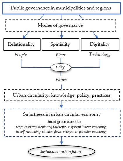 This article is structured as follows. The introductory section is followed by a theoretical discussion that revolves around the ideas of the city as a dissipative structure and urban metabolism, and continues to the conceptualization of an urban circular economy and its three conditioning aspects—those of relationality, spatiality, and digitality. The last element of the framework is urban governance and, more precisely, the connection between the modes of governance and urban smart-green transition. The next section discusses the methodological underpinnings of this article, followed by an empirical analysis of the case of municipalities in the Tampere urban region, Finland. The theoretical views and empirical analysis are synthesized in the discussion section. Lastly, the results of this article are briefly encapsulated in the concluding section.