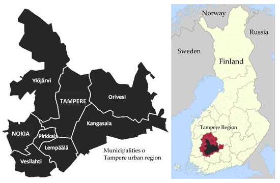 The location and area of the Tampere urban region and a wider intermunicipal regional authority known as Tampere Region are presented in Figure 4.