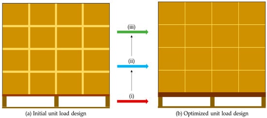 Visual representation of the unit load optimization method proposed by Quesenberry et al. [7]. The method incorporates diverse design combinations in which (i) the pallet top deck stiffness is increased, leading to (ii) increased compression strength of the stacked corrugated boxes, and the resulting opportunity to (iii) reduce the board grade of the corrugated boxes while still achieving the same unit load compressive performance.