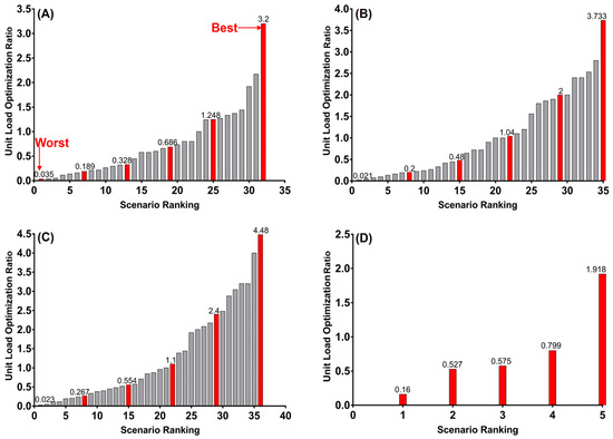 Rankings of investigated unit load scenarios from various wood species groups based on unit load optimization ratio. (A) Displays results of HD HW group, (B) displays results of LD HW group, (C) displays results of GSYP group, and (D) displays results of KD SYP group. Note: Red columns within plots indicate unit load scenarios selected for environmental analysis.