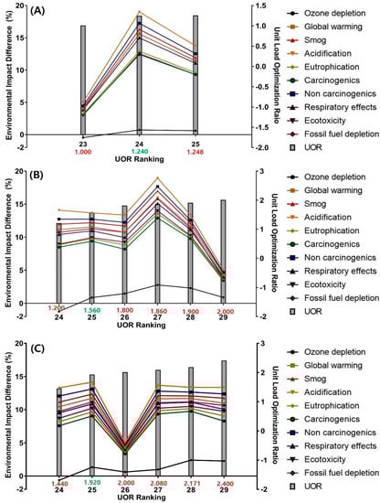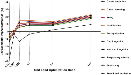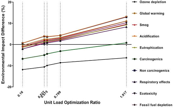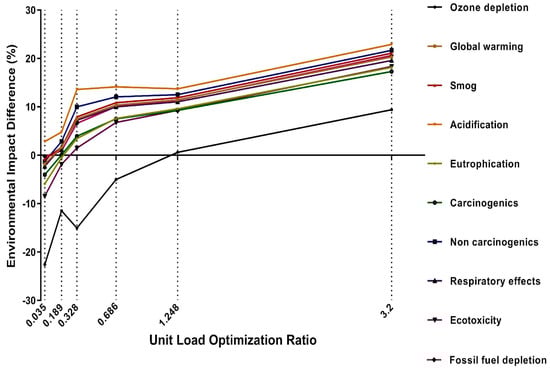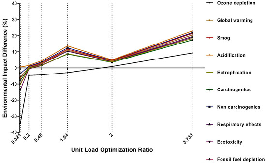 Figure 5 presents the environmental impact difference of the LD HW group’s initial unit load designs and optimized unit load designs. Like the HD HW group, optimizing the first investigated unit load scenario with a UOR of 0.021 decreased environmental performance up to 35% in most impact categories except acidification. As the UOR increased, more and more impact categories started to show environmental benefits from the unit load optimization method. The unit load scenario with a UOR of 0.2 reported improvements in environmental performance from six impact categories, excluding ozone depletion, eutrophication, carcinogenics, and ecotoxicity. Moreover, all impact categories indicated that optimizing the unit load could generate environmental benefits as much as 22.85% within the LD HW group. The base scenario for minimum required condition analysis was set to 2 UOR in this case.