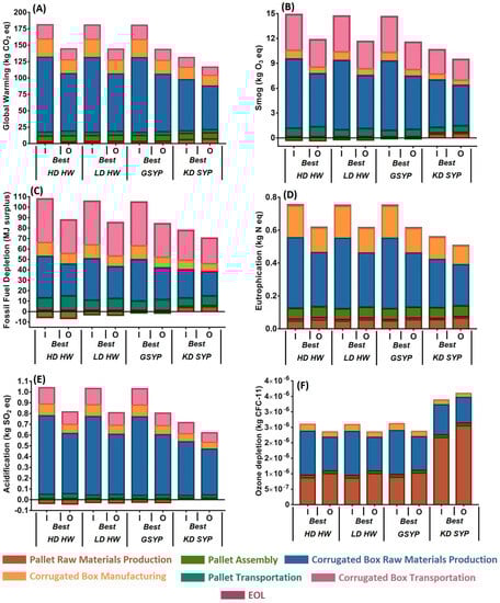 Figure 8 presents contribution analyses on six environmental impact categories: global warming potential, smog creation, fossil fuel depletion, eutrophication, acidification, and ozone depletion for each wood species groups’ best case scenarios. The most significant contributors to global warming potential and acidification were the corrugated box raw materials production phases. Two leading contributors to smog creation and fossil fuel depletion were corrugated box raw materials production and transportation phases. Eutrophication was predominantly affected by corrugated raw materials production and box manufacturing processes. Ozone depletion was heavily affected by the pallet raw materials production phase, followed by the corrugated box raw materials production phase. Regarding the trend of ozone depletion, this trend was exceptionally difficult to generate a positive impact through the unit load optimization method, especially when compared to all other impact categories. It required a relatively high UOR before observing any environmental benefit in terms of ozone depletion, and unit load scenarios in the KD SYP group were not able to create environmental benefit even with the high UOR. This was mainly because ozone depletion is governed by pallet raw material associated factors, mainly heating for the kiln dry process of lumber, while corrugated box-related processes controlled the other impact categories. This study’s adopted unit load optimization method basically adds chemically unprocessed wood materials to the pallets top deck in order to decrease the chemically processed materials in the corrugated boxes. Consequently, environmental benefits in terms of ozone depletion, which is mainly governed by the pallet raw materials production phase, cannot easily be achieved until there is sufficient reduction of corrugated box raw materials phase to mitigate the effects of the pallet raw materials production phase.