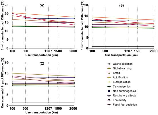 Environmental performance change of unit load optimization method as a function of different use phase transportation distances and wood species groups. (A) Presents results from HD HW group, (B) presents results from LD HW group, and (C) presents results from GSYP group.
