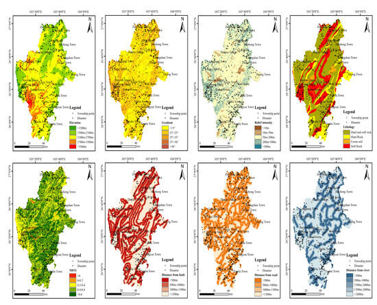 The DEM and NDVI data are openly available in the geospatial data cloud platform at [https://www.gscloud.cn/] (accessed on 3 May 2023). Geological hazard point data and 1:200,000 geological maps are openly available from the Geographic Remote Sensing Ecology Network platform at [http://www.gisrs.cn/] (accessed on 4 May 2023). Water system and road data can be obtained from the National Catalogue Service for Geographic Information at [https://www.webmap.cn/] (accessed on 4 May 2023).