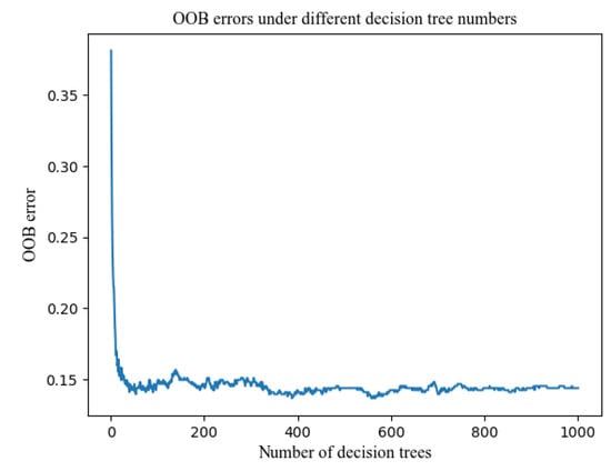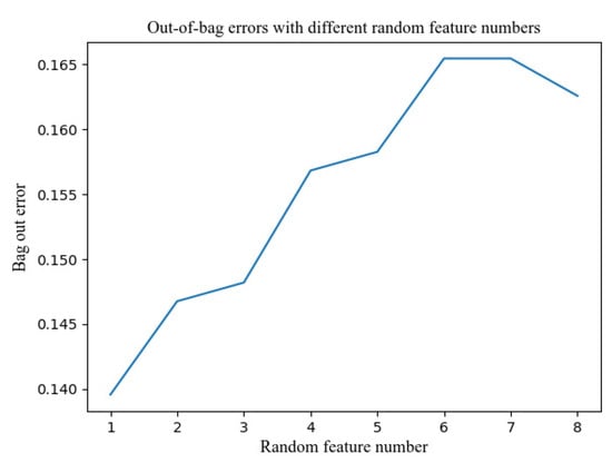 The accuracy and performance of the random forest model are closely tied to the selection of model parameters, as only the most appropriate parameters can fully exploit the model’s potential. In the random forest algorithm, each decision tree is constructed using a random subset of features. The size of this subset is controlled by setting the maximum number of features. Therefore, determining the optimal feature number is a critical consideration in establishing the model. In this study, the out-of-bag error (OOB) is utilized to explore the optimal feature number. The OOB error is calculated using Bootstrap sampling, where approximately 36% of the sample data are left uncollected. These uncollected samples are then employed to evaluate the model’s classification prediction performance and calculate the error rate. Through iterative analysis using the Python programming language, the OOB error is statistically analyzed under different feature numbers (Figure 4). A smaller OOB error indicates higher prediction accuracy for the corresponding model. Generally, it is recommended to set the maximum number of features to a value greater than 1. This enables each decision tree to consider multiple features during the splitting of nodes, facilitating a better capture of feature interactions and information. Conversely, if the maximum number of features is set to 1, each decision tree will only consider one feature when splitting nodes, potentially limiting the performance of the random forest. From Figure 4, it can be observed that the OOB error is minimized when the number of features is 2 and increases when the number of features exceeds 2. Based on this analysis, the feature number for this model is set to 2.