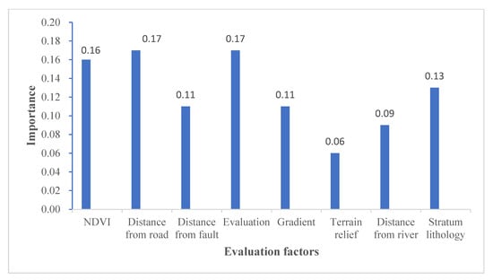 The 497 geological hazard points within the study area were labeled as the first category, denoted as 1. Similarly, the 497 non-geological disaster points selected based on the CF prior model were labeled as the second category, with the label 0. This resulted in a total of 994 sample data points with categorical attributes. The CF value of each sample point, obtained through the ArcGIS multi-value extraction to point function, was used as the training and testing data for the random forest model. Thus, each sample point contained the attribute values of each evaluation factor and a category label. The dataset was divided into 70% training data and 30% test data, comprising both disaster and non-disaster points, which were then input into the random forest model. Using PyCharm, the random forest model calculated the Gini coefficient reduction value for each evaluation factor during node splitting, and the importance of each evaluation index was determined using Equation (2) as the factor weight. The resulting weight diagram of the evaluation factors (Figure 6) illustrates the impact of NDVI, distance from a road, and elevation on geological disasters. In the context of geological disaster prevention and control, efforts should focus on addressing and mitigating the effects of these three factors.