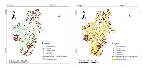 - The medium-susceptibility areas are primarily distributed along the fault zone, characterized by relatively gentle slopes compared to the highly prone areas. Human engineering activities are generally prevalent in these areas. Prevention measures should include restrictions on human engineering activities and the implementation of scientifically and contextually appropriate engineering measures to control small-slope geological disasters. The occurrence of disaster-prone areas in geological settings will exert a significant impact on sustainability, environmental integrity, and human society. These areas exhibit relatively unstable geological conditions, resulting in a high incidence of geological disasters that impede local resource development and production activities. Moreover, these disasters will cause environmental pollution and inflict damage on the ecosystem, thereby hindering local sustainable development. Simultaneously, the occurrence of geological disasters will pose a grave threat to the safety of life and property, as well as the quality of life for residents.