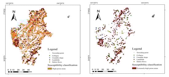 The weighted superposition grid map of CF values in the study area is divided into four levels, namely, low susceptibility (Figure 7a), medium susceptibility (Figure 7b), high susceptibility (Figure 7c), and extremely high susceptibility (Figure 7d). This division is achieved using the natural breakpoint method commonly employed in the ArcGIS reclassification function. The resulting zoning map of geological disaster susceptibility in Huize County, based on the deterministic coefficient model and random forest model, is presented in Figure 7. To validate the susceptibility zoning map, the locations of the previously occurred disaster points within the study area are examined. It can be seen that the susceptibility zoning results obtained in this study align closely with the distribution of disaster points, thereby offering valuable scientific references for relevant departments in their work.