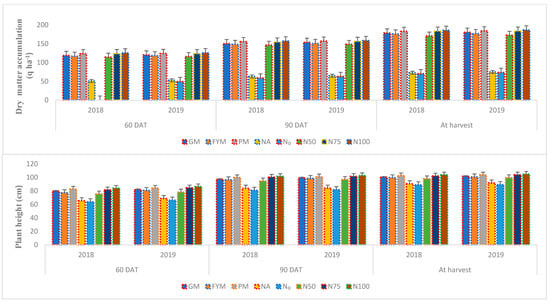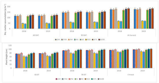 Influence on plant height and dry matter accumulation of the application to rice of different organic amendments and nitrogen levels in an R-W cropping system at Dyal Bharang, Amritsar. Note: GM = green manure; FYM= farmyard manure; PM = poultry manure; NA = no application of amendment; N0 = control, N50 = 50 kg N ha−1; N75 = 75 kg N ha−1; N100 = 100 kg N ha−1 (bars represent error bars).