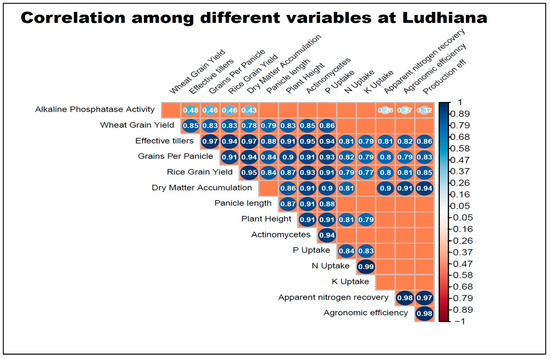 Correlation matrix depicting relationships between different variables and rice and wheat grain yield (the reported correlation coefficients are significant at p < 0.05; blanks indicate non-significant correlation).