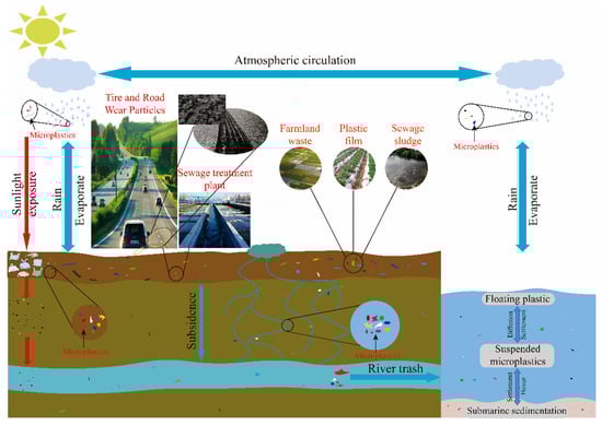 Due to their low price, extreme durability, light weight, and good ductility, plastics are now widely used in the construction, healthcare, electronic components, automotive, agriculture, and food packaging industries [1,2,3,4]. And because of the durability of plastics, they also pose a huge environmental hazard. Studies have shown that global plastic waste is expected to reach 270 million tons by 2060 [5]. Waste plastics undergo physical, chemical, biological, and other forms of wear, consumption, and decomposition, resulting in particles less than 5 mm in diameter being defined as microplastics (MPs) and particles less than 100 nm being defined as nanoparticles (NPs) [6,7,8,9]. Figure 1 shows the source of microplastics. Plastic particles, cosmetics, laundry wastewater, sewage sludge, and atmospheric deposition generated during the friction between motor tires and road surfaces are also important sources of MPs [10,11,12].