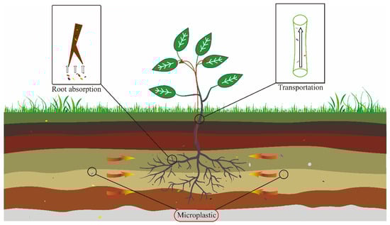 Absorption and transport of microplastics (MPs) in terrestrial plants. Arrows indicate microplastics absorbed by plants.