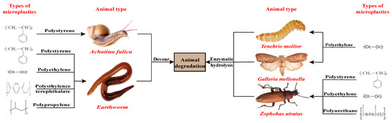Animals can degrade MPs through phagocytosis or enzymes secreted by microorganisms in vivo. Figure 3 summarizes the process of MP removal in animals. Some studies have reported that yellow mealworms can survive by eating PS, which leads to a decrease in the quality of PS [83]. Baeza et al. [84] found that MPs were present in Lumbricus terrestris living in soil contaminated with MPs, and the number of particles in the hindgut was higher. Songet et al. [85] studied the invertebrate snail (Achatina fulica) in soil and found that it also had a certain ability to degrade PS. Only a few animals achieve degradation through ingestion, and most animals achieve degradation through enzymes secreted by their microbiota. Billen et al. [86] showed that both animal mealworms (Tenebrio molitor) and larvae of the greater wax moth (Galleria mellonella) accelerated the biodegradation efficiency of PE. To explore its specific degradation pathway, Zhang et al. [87] isolated a PE-degrading fungus from the gut of the wax moth Galleria mellonella and found that it had a significant effect on degrading PE-MPs. In addition, Luo et al. [88] found that larvae of Zophobas atratus (Coleoptera: Tenebrionidae) have certain degradation effects on three types of polystyrene (PS), PE, and polyurethane (PU), and their degradation is related to changes in the intestinal microbial community and digestive enzyme activity. Most of the degradation ability of animals is determined by the microorganisms in their bodies, so microbial degradation is worthy of our attention.
