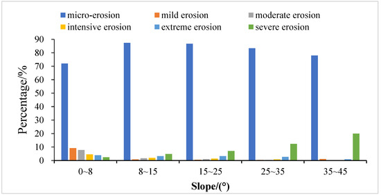 | Slope/(°) | Erosion Area/km2 | Erosion Modulus/ (t·(km2·a) −1) | Total Erosion/ (10,000 t·a −1) | Area Ratio/% | Erosion Rate/% |