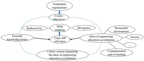 Engineering education accreditation requires course teaching points not only of essential knowledge and skills but also of professional ethics, sustainable development, leadership and self-learning skills related to engineering. Compared with these points of knowledge, those related to engineering are unsystematic, scattered, rigid, remote from one another and arbitrarily connected. An attempt is made to integrate the ideas and elements of engineering education accreditation into the course content using the radioactivity and divergence of mind mapping, and a valid method of linking essential knowledge with the ideas of engineering education accreditation using mind mapping is proposed.