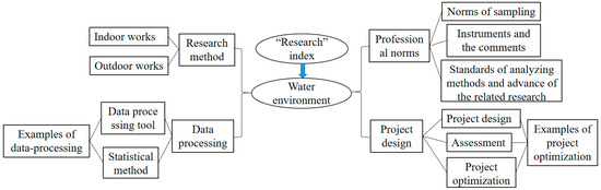 - Construction of a mind map integrating the “Research” idea: The course is required to achieve the index of “Research” through the Geochemistry course as follows: Mastering the experimental theory and using experimental tools and instruments to perform experiments and design schemes; collecting and analyzing experimental data and providing reasonable conclusions; and selecting proper routes to solve problems related to hydrology, water sources and water environments. A Geochemistry course takes elements as studied objects and is devoted to chemical actions and chemical evolution. Water environmental chemistry is focused on to construct the mind mapping of the “Research” idea. The four aspects of analyzing methods, data processing methods, occupational standards and norms, and designing and optimizing of projects are linked to the essential knowledge point of water environments, and their logic and relevance are defined (Figure 2). The course content integrating the “Research” idea is detailed in Table 2. During implementation in class, the constructed course content for the “Research” index is naturally introduced when the essential knowledge point is explained. The “Research” ideas of experimental tools and methods, data analysis, problem solving and thinking model, which is related to the knowledge point of water environmental chemistry, are integrated into the course content. The ability to design projects to solve complex water environmental problems is achieved.