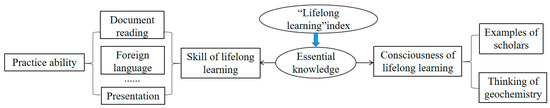- Construction of mind map integrating the “Lifelong Learning” idea: During this module, students are expected to efficiently communicate with their counterparts and the public regarding complex hydrology and water resource engineering problems, including writing, presentation, expressing and responding to instructions and having the consciousness and ability to engage in self-study and lifelong learning. Two aspects were selected to construct this mind map based on the essential knowledge points. Typical examples of geochemistry scholars and the long journey for some theories are introduced to cultivate the consciousness of lifelong learning. Learning skills are improved by the extracurricular practices of document reading and presentation (Figure 4). The course contents integrating the “Lifelong Learning” idea are shown in Table 4. The index of “Lifelong Learning” is achieved by integrating the related consciousness and skills of self-study and lifelong learning.