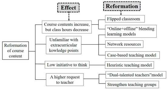 Engineering education accreditation follows the idea of “reverse design, forward implementation”. Training objectives are determined according to specialty characteristics and social needs. Graduation requirements are formulated based on training objectives. Then, a scientific training plan and course syllabus are developed. Specific courses and course content are needed to respond to graduation requirements and training objectives and achieve the supported graduation requirements [35,36]. Thus, graduation requirements become the criteria that course content is based on [6]. Every course supports different graduation requirement indexes since every course has different characteristics and contents. The supported graduation requirement indexes differ greatly for different majors even if sharing the same course [37]. Therefore, the construction of course content should be guided by the demands and training objectives of the majors.