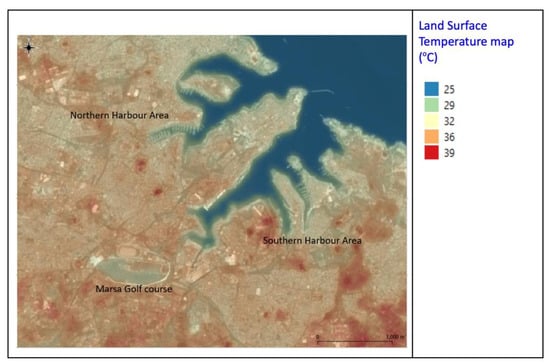 Spatial distribution of LST (°C) within the Northern and Southern Harbour Districts of the Maltese Islands estimated from LANDSAT 8 TIR that was acquired on 25 July 2020.