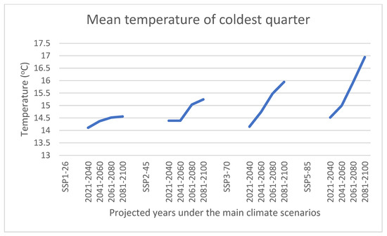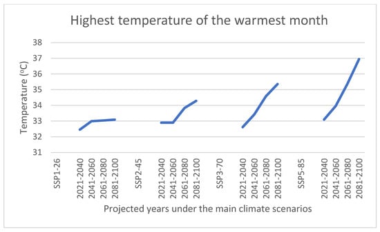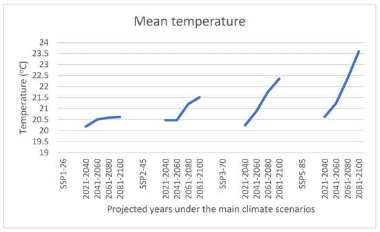Figure 2, Figure 3 and Figure 4 show some of the projected CMIP6 temperature-related measures for the Maltese Islands under the chosen climate scenarios SSP1-2.6 (best-case scenario), SSP2-4.5, SSP3-7.0 and SSP5-8.5 (worst-case scenario). In the SSP notation, the first number refers to the assumed shared socio-economic pathway (SSP), and the second one shown in italics refers to the approximate global effective radiative forcing (ERF) [34] in 2100. The optimistic scenario (SSP1-2.6) assumes a peak and decline of greenhouse gas (GHG) emissions by 2050 and shows a projected stabilisation of the mean and maximum ambient air temperature. On the other hand, SSP5-8.5 assumes high economic growth, low population growth, and high fossil-fuel use. The difference between the two results based on SSP1-2.6 and SSP5-8.5 in terms of temperature (°C) is circa 4 °C (Figure 2 and Figure 3). The higher rates of temperature increase are evident for all time periods under the remaining climate scenarios. Particularly evident are the temperature gradients of the profiles shown under SSP5-8.5. These values are to be treated as approximate projections, and one should not exclude that these will be accompanied with extreme values as part of the natural climatic variability of the Maltese Islands. The projected temperature profiles representing the mean ambient temperature of the coldest month continue to point to a warmer climate during the peak of the winter season, bordering a 2 °C difference between 2021 and 2100 for SSP5-8.5. These results therefore point to a potentially marked increase in the UHI that is only partly attributed due to a warming climate. The degree of UHI will of course be further augmented through continuous urban growth and further extension of the artificial land cover in Malta [35].