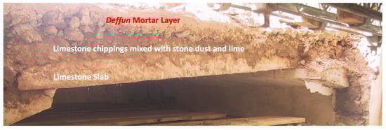 The traditional construction of the roofing “system” [16] is in fact a “sandwich” layer as follows (Figure 5) from bottom to top: limestone slabs resting on stone arches or, later, beams made of timber or iron; limestone chippings mixed with stone dust and lime; and finally the surface layer of deffun mixed with lime. A similar type of construction is also present in traditional buildings in many of the neighbouring Mediterranean countries [49]. It is important to note here that the Mediterranean—and Malta is no exception—is characterised by flat roofs which not only have an important function of collecting the (often scarce) rainwater, channelling it to underground cisterns to be stored for use during the dry summer months, but also have a social function, where families and friends often gather together during the cooler summer evenings to entertain each other, and often eat together. This is very different from the usual function of roofs in colder climates. It must be pointed out here that deffun mortar roofs, being hand laid, are notoriously inhomogeneous—a feature of these roofs which will be taken up later, when discussing our results.