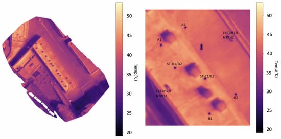 Drone-assisted infrared thermography images showing temperature scaling from hottest (light colour at 50 °C) to coldest (dark colour at 20 °C) of historical barracks (roof part traditional/part hybrid) located at Fort St. Angelo, August 2021 (internal technical report by subcontractors to the EO4HBCS project, SISTEMA [60]).