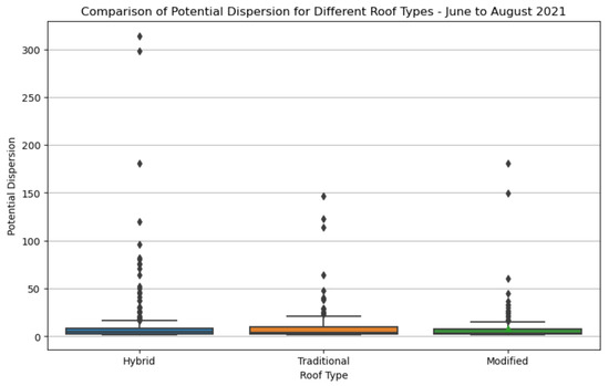 Potential dispersion results show a better overall performance for traditional roofs in the hottest summer months of June, July and August 2021.