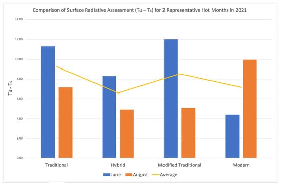 Comparison of surface radiative assessment for two representative hot months in the summer of 2021 showing a higher average for traditional roofs. NB High emission = low transmission.