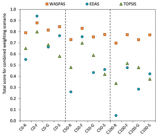 3.4.1. Effect of Weighting Scenarios in the Results of MCDM Methods