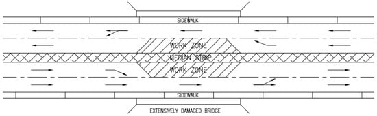 Damaged bridges may disrupt road links following earthquakes and create work zones. According to Padgett and DesRoches (2007) [38], bridges with extensive damage can recover 50% of their capacities within one week after the disaster. Considering that the recovery stage usually does not start immediately after earthquakes, the results from their research will be applied in this study. We focus on two-way two-lane roads (two lanes in each direction), which are common in the US. In this study, a two-way two-lane bridge is deemed fully closed if it is completely damaged; and deemed at 50% capacity if the bridge suffers extensive damage but one lane in each direction remains open. With extensive damage, since one lane in each direction on the bridge will be closed, the link will be degraded into a road essentially with “work zones” in both directions (Figure 2). As a result, there are three typical traffic scenarios for two-way double-lane roads: normal four-lane traffic, disrupted traffic with work zones on the bridge (Figure 2), and fully closed to traffic.