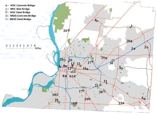The main road network of Shelby County comprises 78 nodes and 115 links. This study evenly distributed the population of each zip code to the nodes inside it. It is assumed there are eight different types of buildings in the community according to the building classification in Hazus (2020) [1]: 1–2 stories wood frame, other wood frame, 1–3 stories steel moment frame, 4–7 stories steel moment frame, 1–3 stories concrete moment frame, 4–7 stories concrete moment frame, 1–3 stories concrete shear wall, and 4–7 stories concrete shear wall. Due to the lack of detailed and reliable data, the percentages of different building types are randomly generated for each zone for demonstrative purposes. Among all the links, it is assumed that 31 of them have bridges on them (Figure 6). There are five different types of bridges in the network: multi-span continuous (MSC) concrete, slab, and steel girder bridges, and multi-span simply supported (MSSS) concrete girder and steel girder bridges. In this study, it is assumed that only bridge damage may cause the failure or degradation of a link. Of the 115 links, 31 are, therefore, vulnerable to earthquakes due to the existence of bridges (B1–B31) on them (Figure 6). The geographic information of the nodes and bridges is available on Google Maps and through ArcGIS database. The households of each zone are divided into single-family and multi-family households. The percentage of single-family households is 70%, according to the demographics of Shelby County (Census profile 2018) [48].