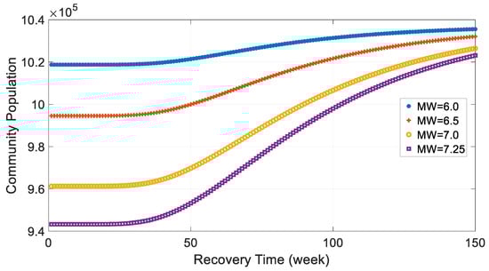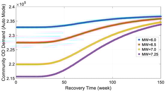 This study assumes the earthquake has an epicenter latitude and longitude of (35.107757, −89.940678). For comparison purposes, the data analysis also explored earthquakes with four moment magnitudes: 6.0, 6.5, 7.0, and 7.25. Given the demographic data, earthquake information, building fragility, and the community population during the recovery stage can be estimated using Equations (2)–(7). The expected total auto-mode OD demand during the morning rush hour at any recovery time can be derived from the household information, community population, and zone information using the Memphis MPO model (Kimley-Horn et al., 2007) [28]. The expected community population and OD demand are shown in Figure 7 and Figure 8 as functions of recovery time. The figures show both the community population and OD demand increase with the recovery time, which conforms to the reality that the displaced residents keep moving back to their original zones due to the restoration of their pre-earthquake dwelling units. The percentage increments in the community population and OD demand are similar because the community OD demand is a rough product of the community household number and the average household trips, considering the latter may only vary slightly among different zones within the community. As shown in Figure 7 and Figure 8, the higher the earthquake magnitude, the smaller the community population and OD demand, and the faster they recover. The lower starting point is consistent with the common understanding that higher magnitude generally causes more damaged housing units, more displaced residents, and greater reduced travel demand. The faster increase is caused by the lognormal distribution of the building recovery time. In this case, most damaged houses will recover within the mean recovery time (Table 2). Figure 7 and Figure 8 also show the changes in the community population and OD demand can be around 10%, which may significantly affect the transportation performance of the community. The considerable difference underscores the necessity to consider the time-dependent population and OD demand when simulating transportation resilience during the post-earthquake recovery stage.