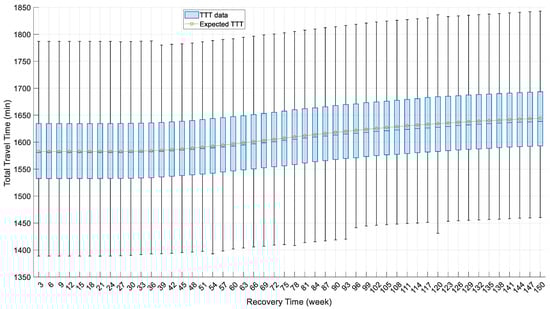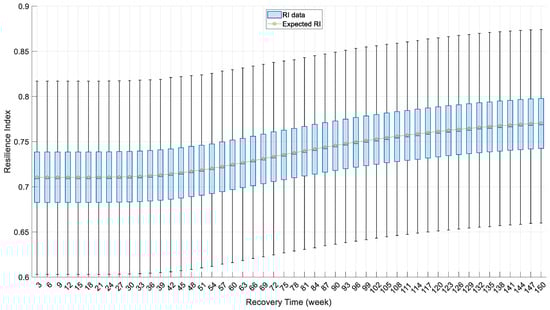 The box plots in Figure 9 and Figure 10 suggest both the expected total travel time and total accident frequency increase with time. Such phenomena are caused by the increasing travel demand along with the recovery process of the population, and thus are in accordance with reality. The increased percentages of the expected TTT and TAF are 3.9% and 14.07%, respectively. The smaller increase in TTT may be caused by the fact that the traffic volumes on most links are lower than their capacities, which reflects a trivial increase in their travel time. Only a few links with high traffic volumes have significant traffic delays and contribute to the increase in TTT. The larger increase in TAF may result from the increased traffic volume. Unlike link travel time, traffic accident frequency is more sensitive to link traffic volume, whether it is below the link traffic capacity or not (Equation (18)). Figure 11 shows that the expected RI also increases with the recovery time, despite the increase in TTT and TAF. It is because the resilience index is related not only to the expected total travel time and accidents on the transportation network, but also to the community population it serves. As a result, the system resilience index of the transportation network gradually increases during the recovery period.