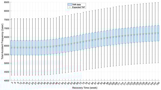 The pre-earthquake TTT and TAF are 1389 and 4305, respectively, assuming no link damage. Figure 9 and Figure 10 show that TTT and TAF for most sampled network damage scenarios fall in ranges of [1533, 1694] and [5464, 7160], respectively. The results suggest that TAF is more sensitive to bridge damages with larger variations as compared with TTT. The less-deviated TTT may be caused by the existence of many redundant links, so there are always alternative paths with similar travel time in case of link damage. The larger variations in TAF may result from partially functional bridges with work zones. This corroborates the traffic accident model in Equation (18), which shows that roads with work zones tend to have higher traffic accident frequencies than fully functional roads, unless the traffic is very heavy. This observation also proves the significance of considering work zone traffic accidents when simulating transportation resilience during the post-earthquake recovery stage, especially when the recovery takes a very long time. Although the expected TTT in this case study is relatively stable, the expected TAF presents a time-evolving difference of 14.07%, which is non-negligible. Like traffic efficiency, traffic safety is also critical to the travel experience of the remaining and recovering residents. The considerable difference in TAF throughout the recovery stage confirms the significance of simulating the time-evolving community population and travel demand. Also, as mentioned above, many countries and regions have many older buildings designed using codes with lower standards or even pre-code seismic standards (Bilham, 2010; Ilki and Celep, 2012; and Wang, 2008) [50,51,52]. For those areas, the impact of earthquakes on population, travel demand, and traffic patterns can be more significant, so that both TTT and TAF may exhibit considerable changes during the recovery stage.