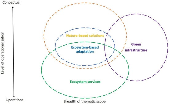 Ecosystem-based adaptation (EbA), urban green infrastructure (UGI), and ecosystem services (ESs) are linked to NbSs (see Figure 1). Pauleit et al. [18] (p. 29) argued that NbSs are a recent and broader concept, “an umbrella term with a distinctive focus on the deployment of actions on the ground” that encompasses the aforementioned concepts.