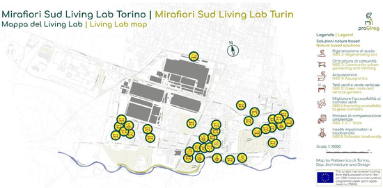 Examples of NbS implementation in Mirafiori Sud—proGIreg project (map by Politecnico di Torino, Dep. Architecture and Design).