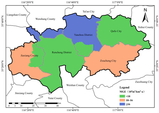 | Resource supply function | Groundwater resource quantity | MGE ≥ 16 × 104 m3/km2·a | Other | MGE < 10 × 104 m3/km2·a |