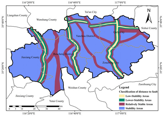 | Distance to fault | Stability Areas | Relatively Stable Areas | Lower-Stability Areas | Low-Stability Areas |