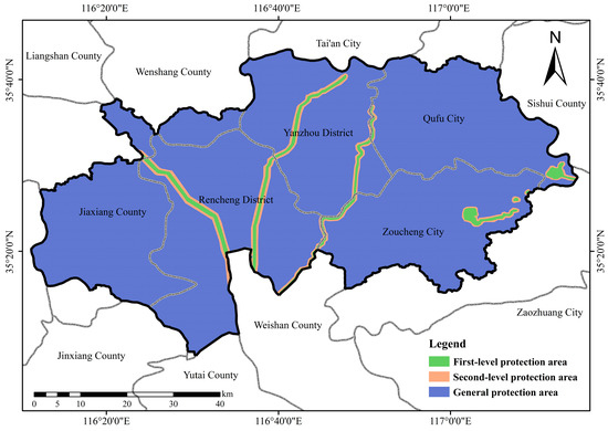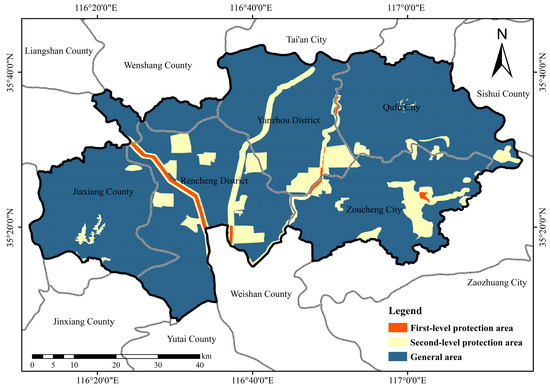- Ecological protection zones: These zones are mainly distributed within national (provincial, municipal) ecological protection areas, wetland parks, and lake–reservoir-type drinking water sources, representing typical ecological protection areas. To maintain ecological and geo-environmental stability in these areas, the large-scale exploitation and utilization of groundwater resources should be avoided. It is recommended to control the intensity of extraction during development and utilization, ensuring the relative stability of groundwater levels, maintaining a reasonable ecological water level, and avoiding ecosystem degradation. For areas with good water quality, the aim is to maintain the existing water quality, while for areas affected by pollution, protection and restoration measures should be prioritized.