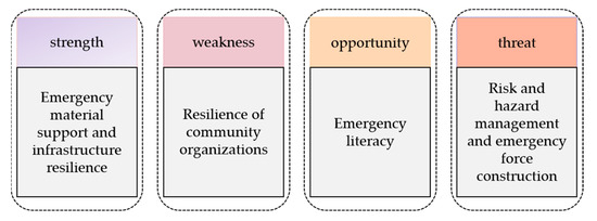 Based on the above analysis, we selected for use a combination of SWOT and AHP analysis methods. The SWOT method is a commonly used quantitative analysis method for formulating development strategies, but it lacks the process of quantitative analysis. Combined with the AHP method, it systematically solves complex multi-factor problems through a combination of qualitative and quantitative methods, which is both practical and efficient. Based on the experts’ ratings of 25 indicators, we calculated the weights of indicators using the AHP method, and evaluated the community’s emergency management ability. Then, based on the weights of the indicators, we identified strengths, weaknesses, opportunities, and threats, and analyzed community response strategies based on this. The SWOT method can be used to study various strategies. For example, it can be applied to Iran’s development of rubber dams or inflatable flexible membrane dams to address drought and waterlogging issues [22]. It can also be used to evaluate the performance issues in the construction industry [23] or the potential for sports tourism in Mersin Province [24], and provide guidance for improving the performance of emergency department nurses [25], achieving a balance between work and personal life [26].