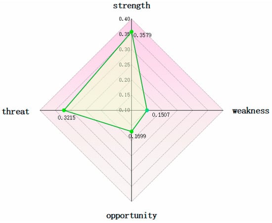 According to the analysis, the evaluation results of the strengths, weaknesses, opportunities, and threats of the Xi’an community are 6.312, 2.657, 2.996, and 5.67, respectively. By standardizing them, the strategic quadrilateral of the community can be obtained. The strategic quadrilateral of the Xi’an community is shown in Figure 4.