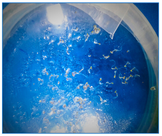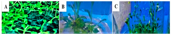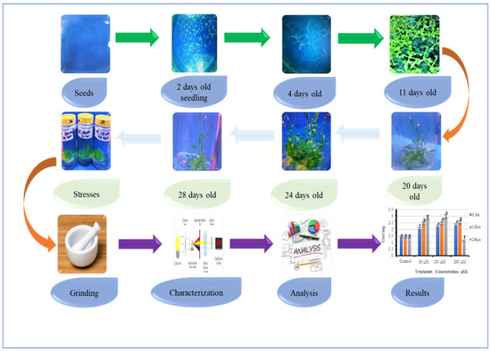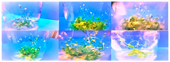 Transgenic T2 (Homozygous) A. thaliana seeds were sterilized with 70% ethanol and were cultivated on Murashige and Skoog (MS) medium at half strength (1/2) [41]. Seedlings were grown in a growth chamber at 25 °C, 60% humidity, and a 16:8 light cycle for 25 days, and plants were used for stresses of drought and metals (Ni and Cu) applications (Figure 1, Figure 2 and Figure 3).