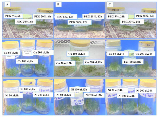 Polyethylene glycol, Cu, and Ni stress treatment at different concentrations (50 μM, 100 μM, and 200 μM) for 6 (A), 12 (B), and 24 (C) h, respectively, on T2 transgenic A. thaliana seedlings.
