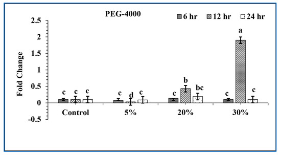 Drought (PEG 4000) stress was applied to transgenic Arabidopsis T2 lines. Based on RT-PCR results, T2 lines of transgenic Arabidopsis showed an expression level of OsPPOGUS in response to drought treatment. Upon 5% PEG stress, maximum fold induction of 0.09 was observed after 24 h, while after 6 and 12 h, it showed lower fold induction (0.07 and 0.03, respectively). The maximum fold induction (0.43) was observed after 12 h for 20% PEG after 12 h of treatment, and lower induction (0.19- and 0.14-fold) was revealed after 24 and 6 h drought stress. Similarly, for 30% PEG, maximum fold induction (1.9) was seen after 12 h, while reduced fold induction (0.1) was observed after 24 and 6 h of drought stress, respectively. Overall, various concentrations (5%, 20%, and 30%) induced PPO expression after 6, 12, and 24 h are shown in Figure 9.